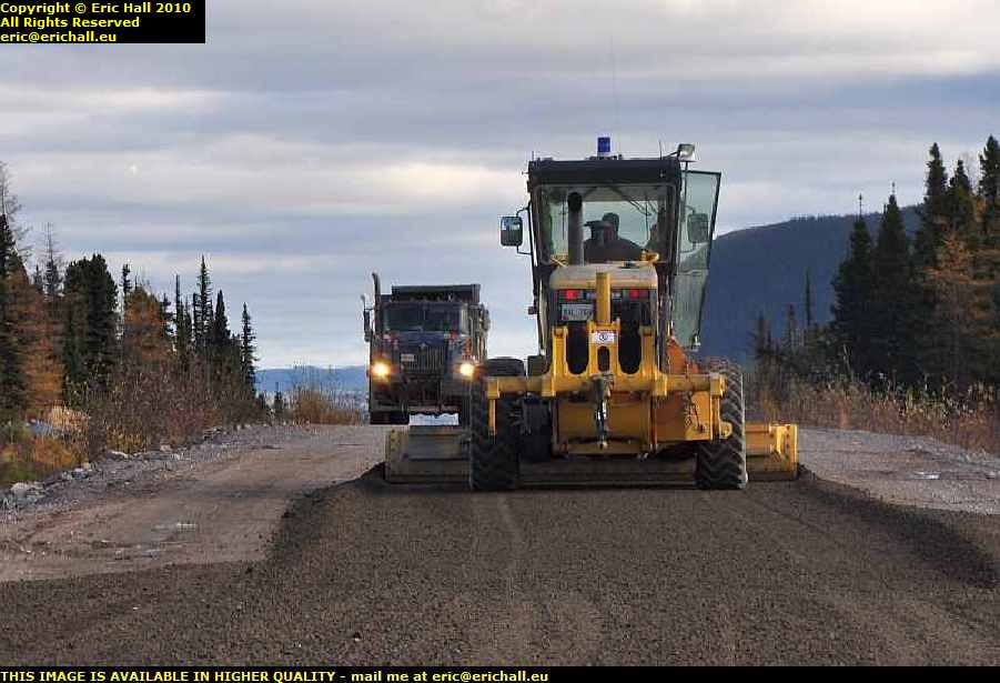 That lorry has just tipped a pile of gravel or whatever out onto the road and the grader is spreading it out. Not before time either because although this part of the Trans-Labrador Highway is nothing like as bad as it was up over the top on the Labrador plateau, nevertheless when you consider that I've been ... errr ... increasing my average speed considerably down some stretches of the highway, around here this is pretty poor.