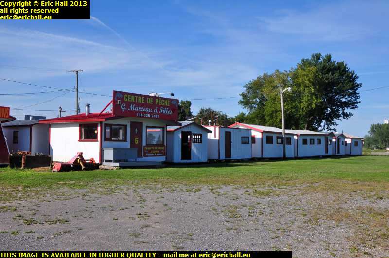 The most exciting thing that happens at Sainte Anne takes place during the months of January and February. There's a kind of fish called tommycod, or poulamon, and this River St Anne is full of them. The best time to fish for them is apparently January and February but of course the river is frozen solid then so anyone who is anybody has a little cabin and he drags it out onto the frozen river. Once he's comfortably installed inside, he cuts a hole through the ice into the water and fishes for the tommycod.