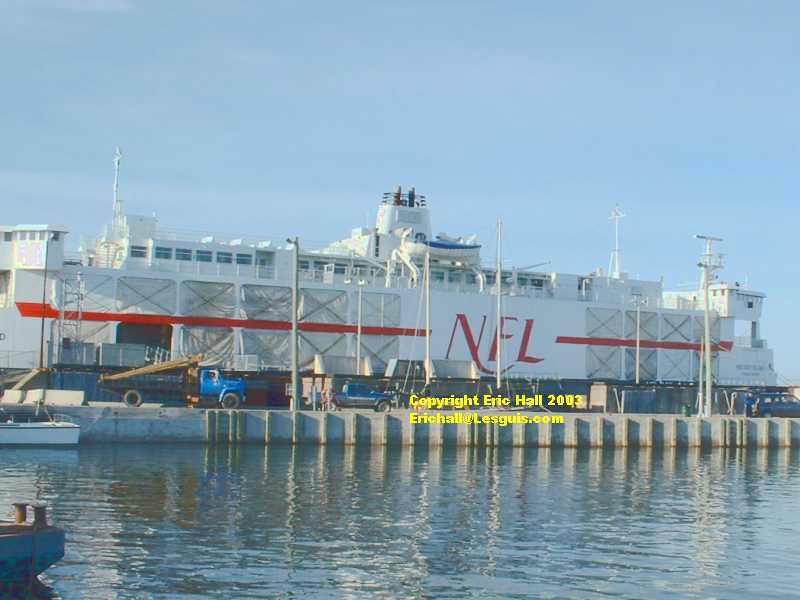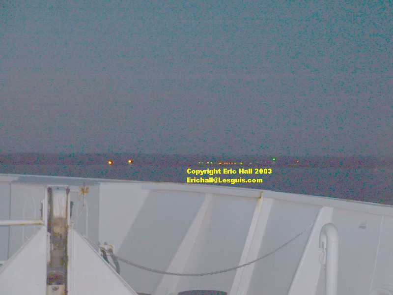 The "Holiday Island" was built in 1971 and is 100 metres long. Its displacement is 2775 tonnes. If you're a European used to travelling on P&0 or Seafrance, that's not much bigger than a lifeboat. On the other hand, if you're used to travelling on the North Carolina ferries, then it's flaming enormous.