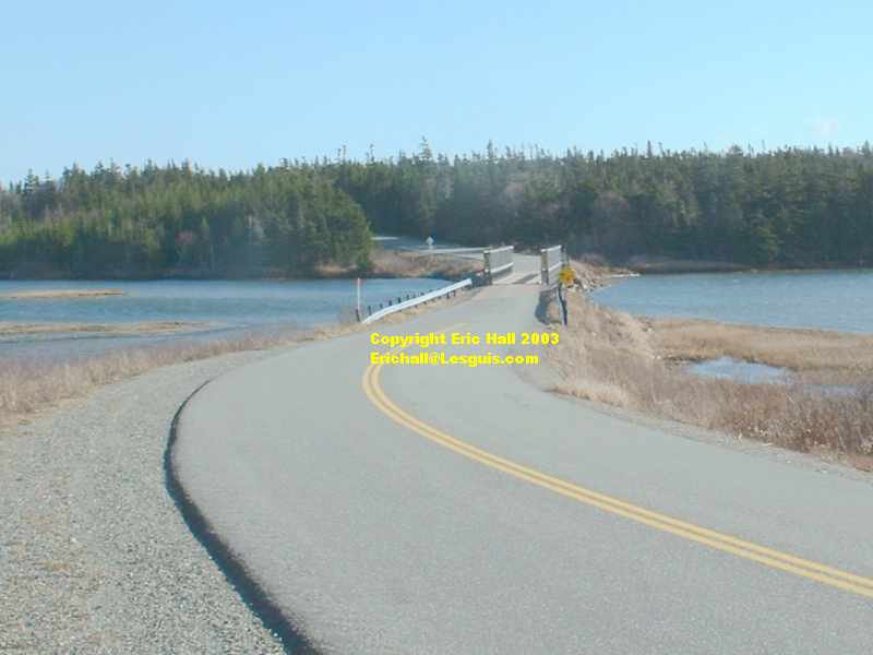 All around here on the coastline were small lakes and inlets which at one time had been bays in the seashore but the drifting coastline had cut them off from the sea. Here on the left is a small single-track bridge over one of them, at Fourchu.