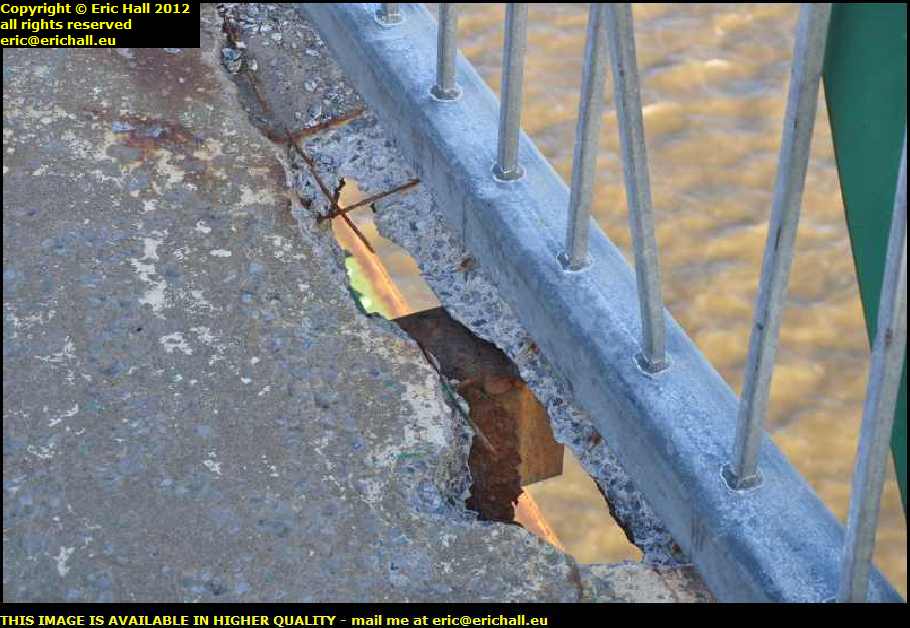 This doesn't look very healthy now, does it? A gaping hole in the pavement where the concrete has rotted and fallen through the deck. With the exposed steel grillage now acting as a conduit for oxidation, then the concete won't even need to rot in order to fall off the bridge and so this hole will expand rapidly.