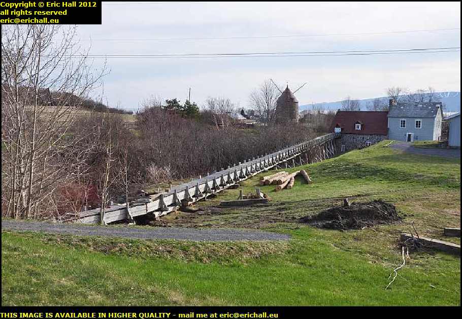 From up here you can see the mill race, and an impressive structure it is too, rather reminiscent of the early trestle railway bridges, carrying the water down to the water mill, which is the red-roofed building just there.