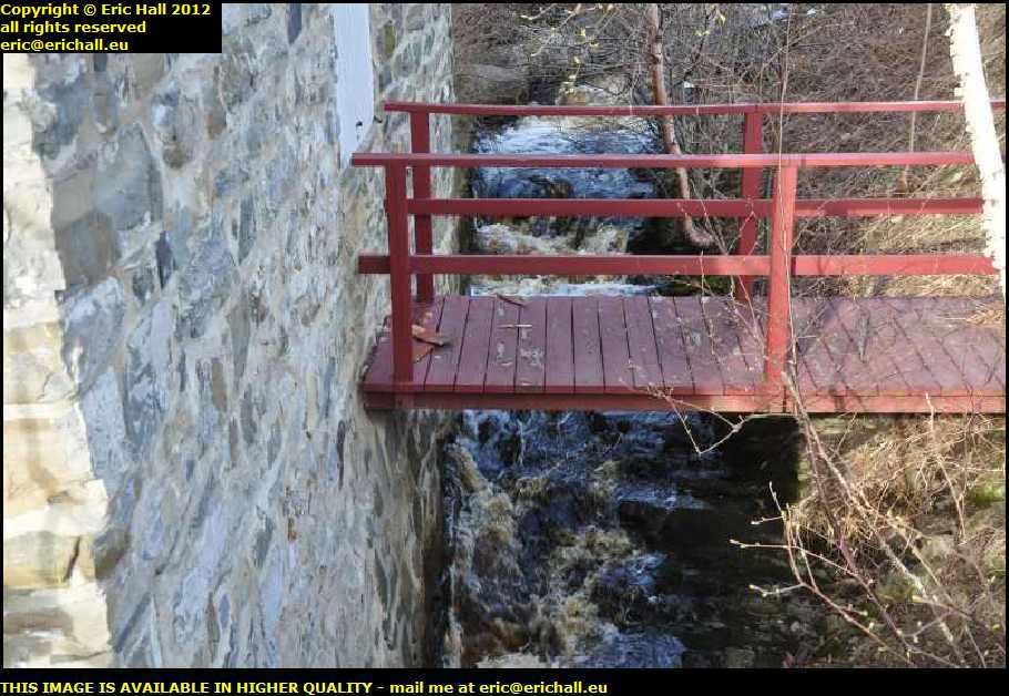 The water that doesn't flow down the millrace tumbles down a little rocky stream at the side of the building as you can see here. Surprisingly, or maybe not, the water is quite red. Maybe there is a considerable amount of iron in the soil around here, or else someone further upstream has been washing a load of cranberries.