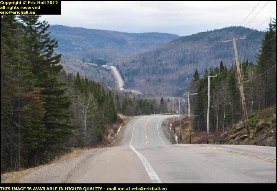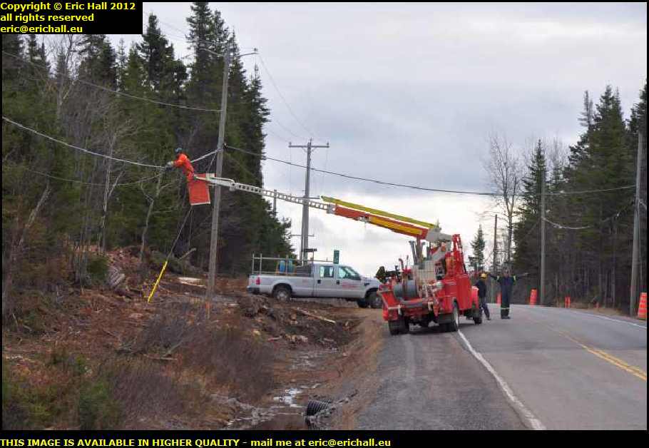 Shortly after this, I encounter some men from Quebec Hydro doing some repair work on an electricity cable. My attention was caught by the truck, parked half-way down the camber of the slope with the man in the cradle slung almost as far out as it would reach, and with not an outrigger in sight.
