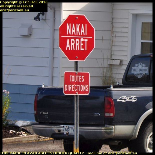What caught my eye on the sign here though was that the word NAKAI was given priority over the word ARRET. This tears to shreds the Quebecois law on the priority of the French language, doesn't it?