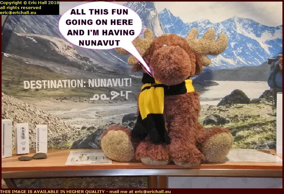 We eventually found this shelf above a radiator, with this lovely poster of Nunavut in the background. This was a likely spot, suitable for him to make his debut appearance on the ship.