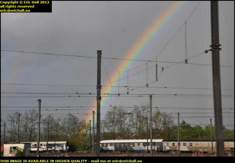 How do you like my rainbow? This photo was taken near Lyon as the train was following the River Rhône. It looked so impressive that I felt like alighting from the train and looking for a spade. In other words, I could really dig this rainbow, man ... "groannnnnnn" - ed ...